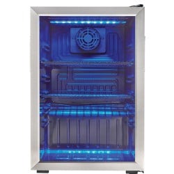 Cool up to 154 (355 ml) cans on three adjustable black-wire shelves. This small refrigerator features forced air cooling, a digital thermostat with blue